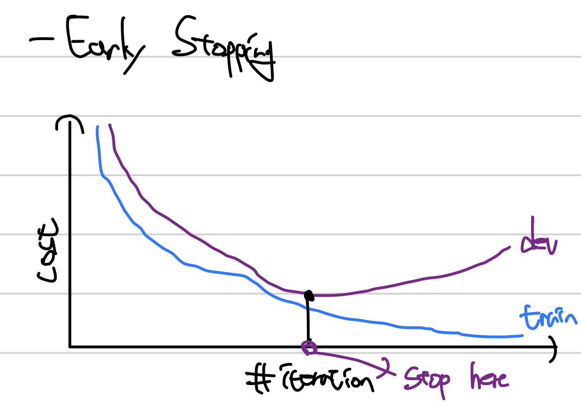 overfitting이 발생하는 지점에서 학습을 멈춰서 그 때의 가중치를 사용한다.