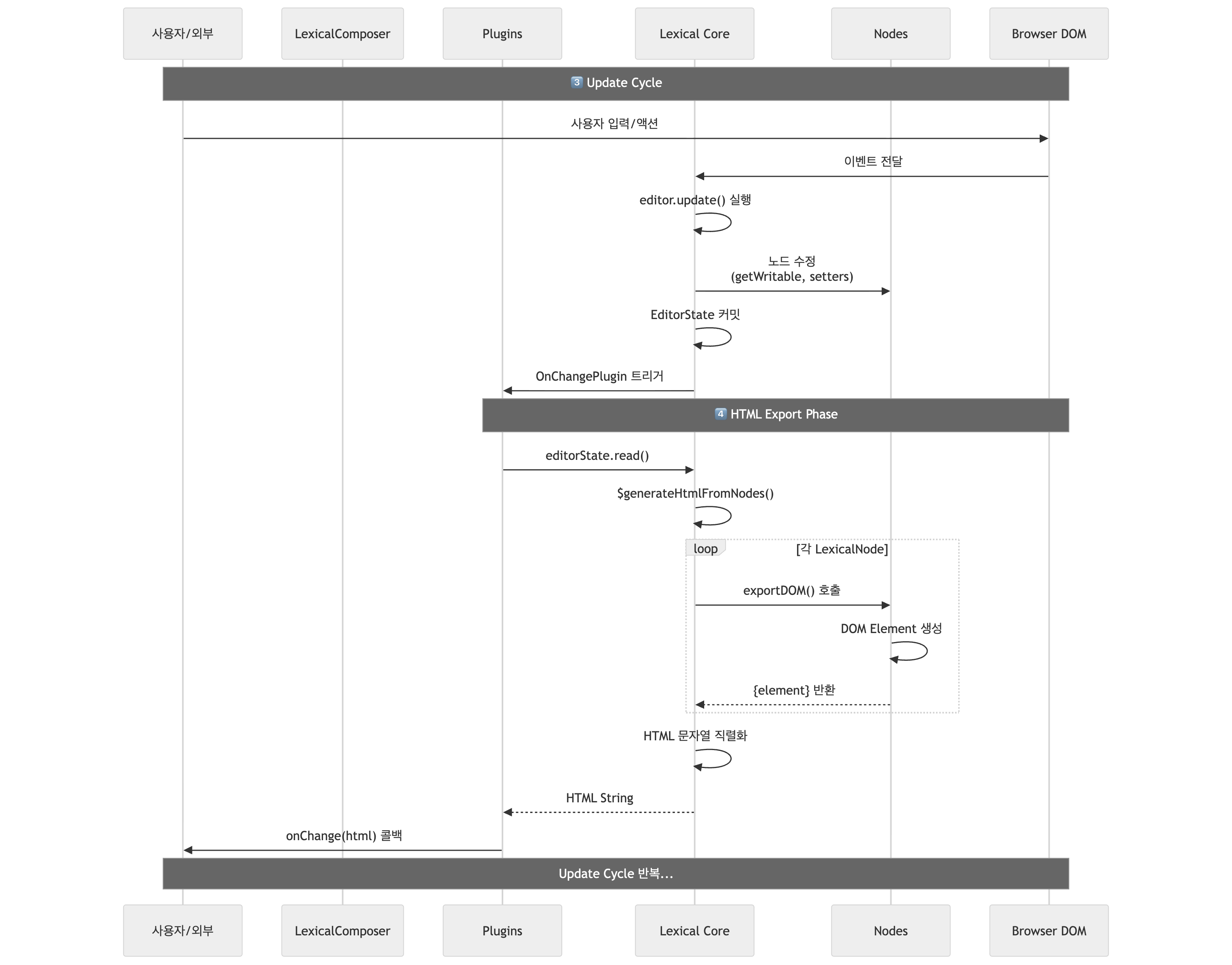 - $generateHtmlFromNodes(): Lexical Nodes → HTML 변환